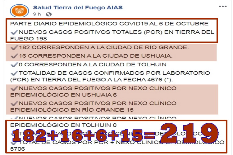 Por un lado el Ministerio de Salud da a conocer y publica una imagen para que sea compartida en las Redes Sociales sobre 198 casos Positivos Nuevos en toda la Provincia, pero publica en el parte escrito que en total sumados los casos Nexo Clínico Epidemiológicolos son 219 en Tierra del Fuego, pero en ningún lugar de la imagen informa que los 198 son solo los casos Confirmados por PCR, lo que Genera Confusión y Descreimiento por parte de la población con algo tan importante como saber cuántos casos diarios se registran en cada ciudad.