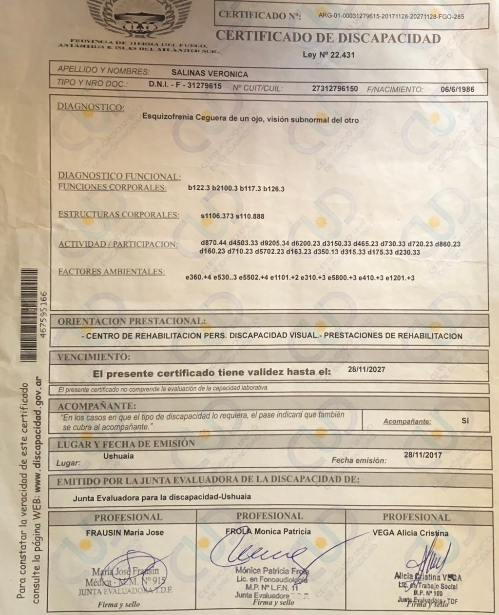 Veronica: Diagnostico: Esquizofrenia de un ojo visión sub normal del otro, Certificado de Discapacidad con validez hasta el 28de Noviembre 2027.
