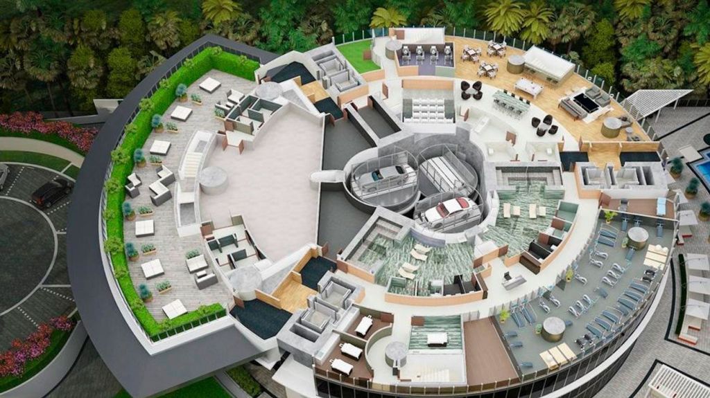 El lujoso edificio tiene seis piscinas, un spa, cabañas, un centro de ejercicio físico, un salón para yoga, cocina equipada para chef, un parque infantil, un bar de champán y bodega de vino.