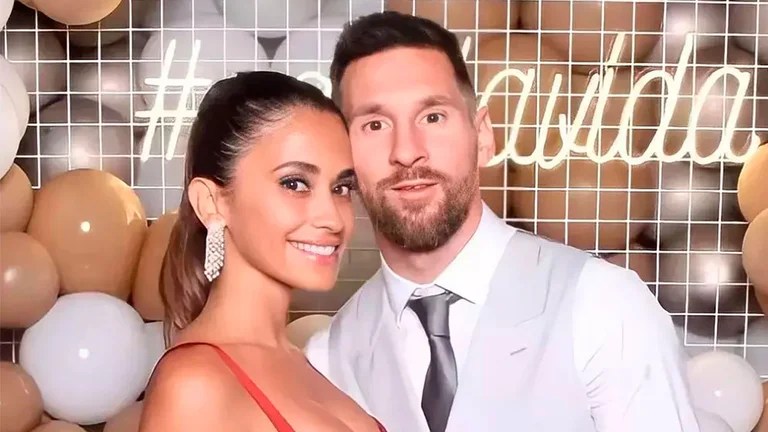 En las imágenes, que son varias y se repiten de manera rápida, se puede ver a Roccuzzo con un vestido de color rojo y a Messi con un traje de color negro, con un chaleco gris y la corbata a tono.