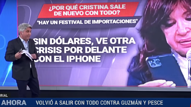 En la imagen que se mostraba de CFK en pantalla, Montenegro observó el móvil que esta portaba en su mano mientras hablaba. «Tengo entendido que este es un IPhone 13, es decir el tope de gama de IPhone. Es uno de los teléfonos a diferencia de este que tengo yo, que es fabricado en Tierra del Fuego de fabricación nacional«, expresó el conductor de A24.
