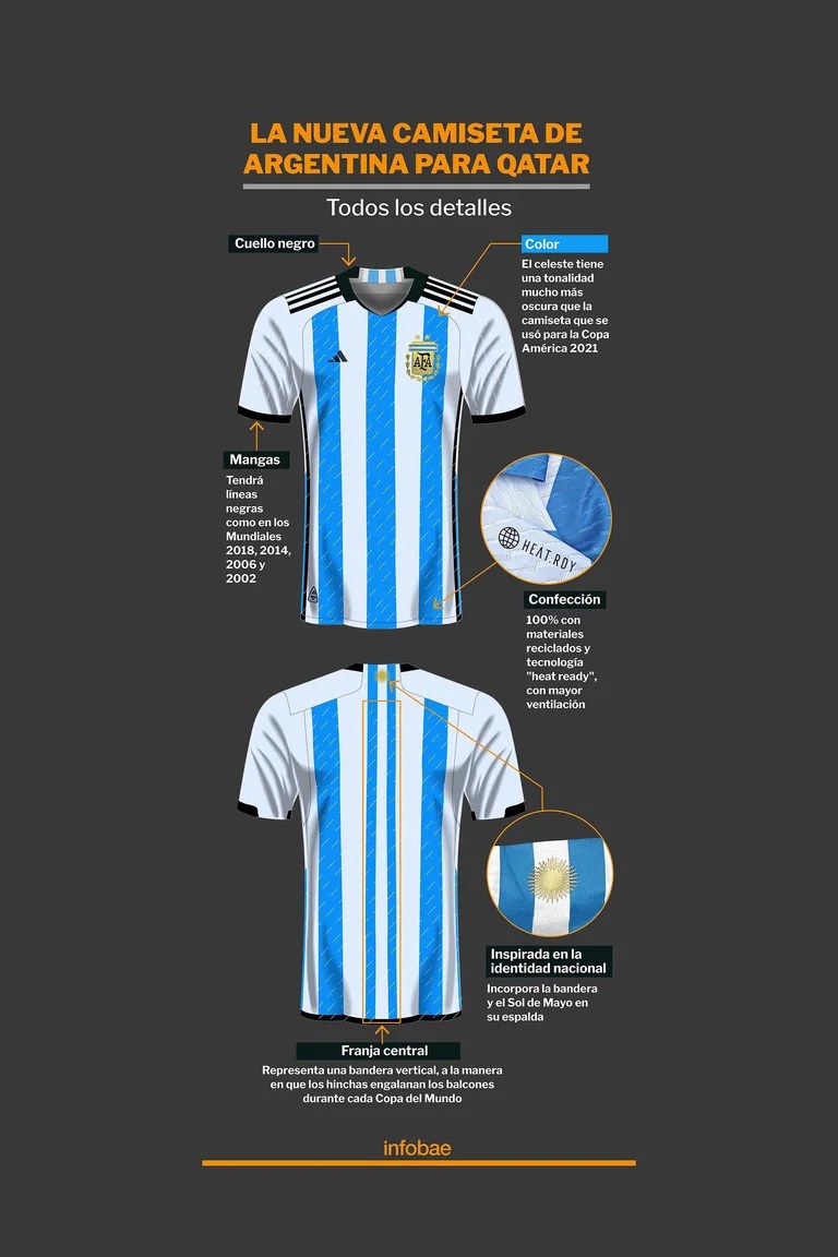Aunque hay un cambio radical en la espalda y en la mitad donde no está el bastón del medio y fue reemplazado por la bandera en sentido vertical, que recuerda la manera como los hinchas cuelgan el símbolo patrio de su país en los balcones durante cada Copa Mundial; y por el otro, incorpora el Sol de Mayo -otro de sus emblemas nacionales en la parte posterior del cuello.