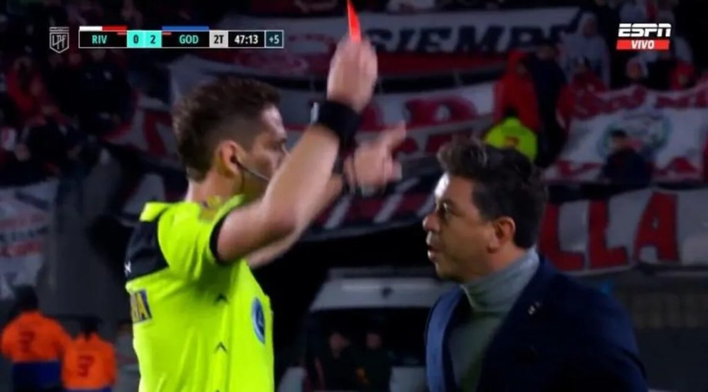 Sin embargo, el entrenador del Millonario lo desafió y se quedó varios minutos más en el campo de juego. Lamolina continuó con las acciones, aún con Gallardo en cancha, y se equivocó además al no agregar cinco minutos más por el largo parate.