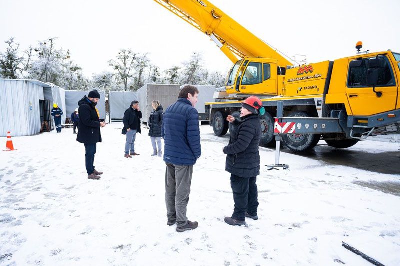 El gobernador Gustavo Melella junto a integrantes de la primera línea del Gabinete, recorrió ayer la obra de montaje del nuevo Hospital Modular de Tolhuin.