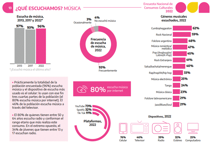 En cuanto a los consumos musicales el rock nacional se posiciono en segundo lugar con un resultado del 59%, a solo dos puntos del puntero «cumbia y reggaetón» que obtuvo el 62%. En en tercer lugar de las preferencias musicales se ubica el folklore Argentino con un 48% y en el octavo lugar del ranking se ubica el denominado «urbano» con un 33%.