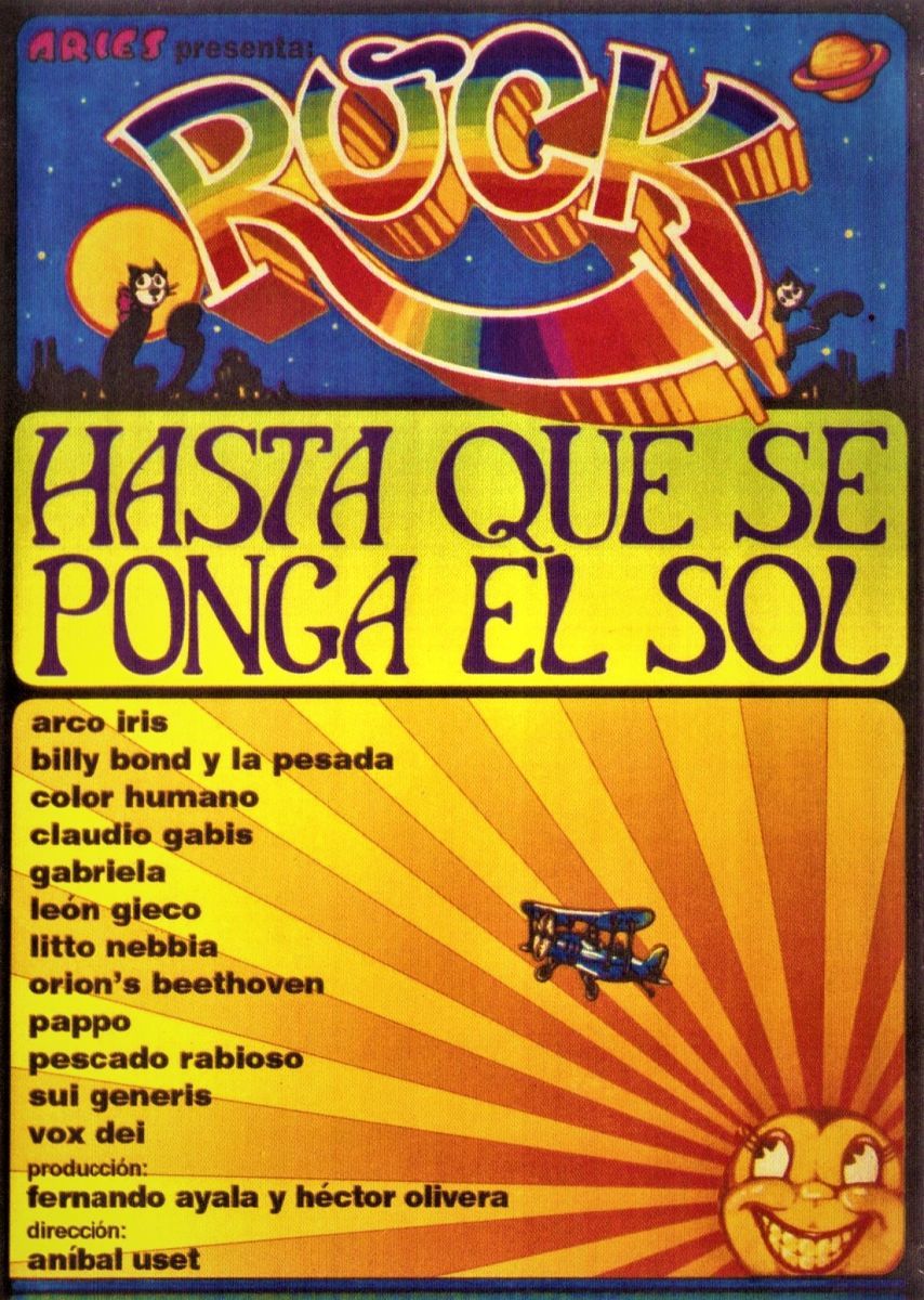 Todo esto nos lleva directamente al primer gran film integral del rock nacional. Hasta que se ponga el sol (1973) de Anibal Uset. El recordado director platense (27/12/1939-19/8/2015) ya había incursionado anteriormente en el mundo que relaciona el cine con la música. En 1965 se había encargado junto al especialista Marcelo Simón, del guión y además de la producción del film Cosquín, amor y folklore de Delfor María Beccaglia. Allí participaron artistas e intérpretes como Atahualpa Yupanqui, Eduardo Falú, Ramona Galarza, Ariel Ramírez, El Chango Nieto, Jorge Cafrune, y los dos grupos eternos y míticos del folklore salteño: Los Chalchaleros y Los Fronterizos. Al año siguiente emprendió con sus técnicos y un reducido elenco un viaje a Inglaterra para rodar, en su debut como director, la comedia musical El rey en Londres (1966), donde no solamente aparece y canta Palito Ortega, sino que también hay imágenes de archivo de The Beatles, The Animals, Herman’s Hermits, y The Spencer Davis Group, entre otros.