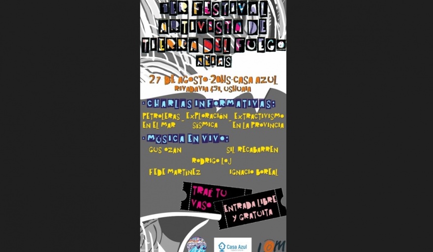 El domingo 27 se llevará adelante el Primer Festival Artivista, en la ciudad de Ushuaia. Se presentarán diferentes artistas y habrá charlas sobre temas relacionados con la problemática ambiental. Entre los temas previstos se anunciaron “las petroleras en el mar, el extractivismo en la provincia y la exploración sísmica”. Será en La Casa Azul y la entrada es libre y gratuita. Dicen los organizadores que será una forma de expresarse y de encontrarse, “con la excusa de la música, pero para hablar de temas importantes también como lo son el offshore, la exploración sísmica y los problemas que nos afectan como comunidad”.