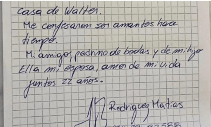 El Sureño tuvo acceso a la carta que dejó escrita en un papel el senador Matías Rodríguez, donde señala que la madrugada del 18 de octubre encontró a su amigo Walter Vuoto y a la “mujer de su vida”, Laura Avila, en la cama matrimonial y que ambos le confesaron que hace meses son amantes.