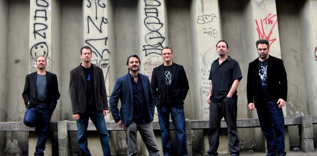 Escalandrum, en pleno ensayo en Bariloche, antes de tocar en el FIMBA. 30 de octubre de 2021. Daniel Pipi Piazzolla, Nicolás Guerschberg, Gustavo Musso, Damián Fogiel, Martín Pantyrer y Mariano Sívori. Foto Prensa FIMBA/Chiwi Giambirtone