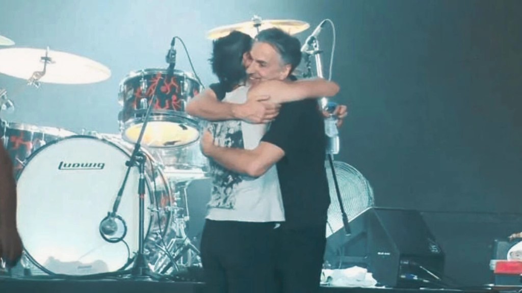 Mientras tanto, su colega y actual músico de Divididos, Catriel Ciavarella se emocionó hasta las lágrimas. En el vídeo difundido por el grupo se aprecia que abandonó el escenario y caminó por los exteriores del estadio hasta llegar a una de las gradas, donde continuó el reencuentro entre Mollo, Arnedo y Gil Solá.