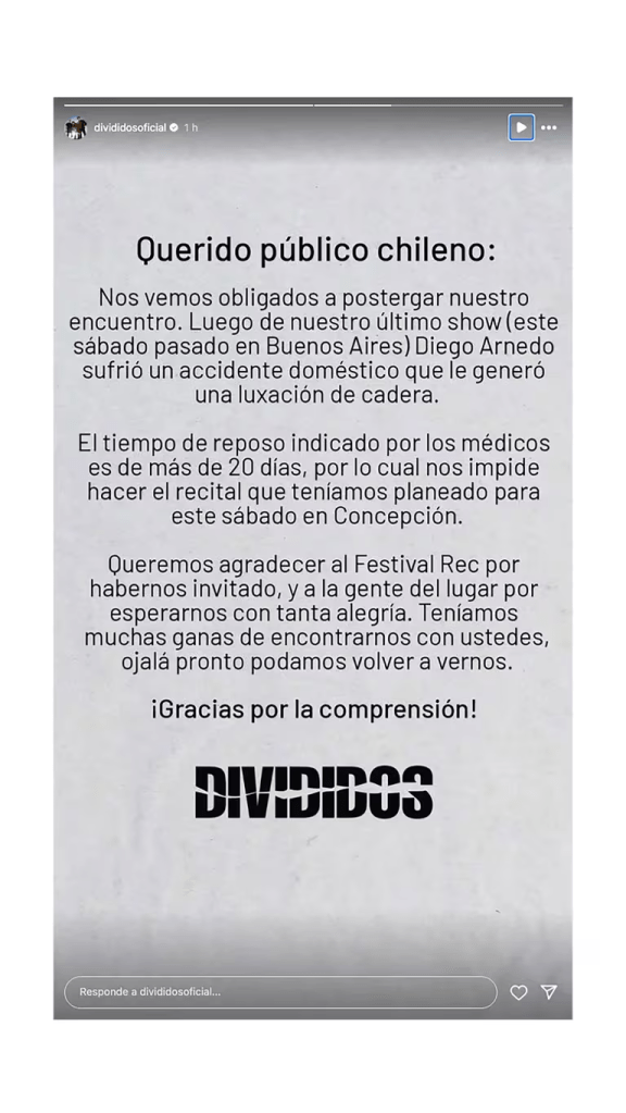 En el texto, recalcan que la recuperación será “de más de 20 días, por lo que nos impide hacer el recital que teníamos planeado para este sábado en Concepción. Queremos agradecer al Festival Rec por habernos invitado, y a la gente del lugar por esperarnos con tanta alegría. Teníamos muchas ganas de encontrarnos con ustedes, ojalá pronto podamos volver a vernos. Gracias por la comprensión, DIVIDIDOS”.