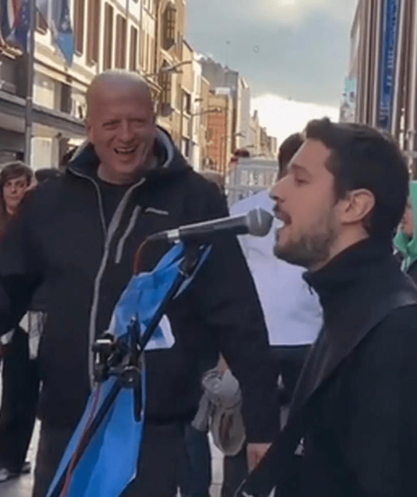 La gente que pasaba por el lugar se frenó a escucharlo, lo empezó a acompañar con palmas y hasta uno de ellos se puso a cantar a los gritos el tema musical. En ese momento, un hombre irlandés paseaba por el lugar, felicitó al cantante y le dio un sentido abrazo.