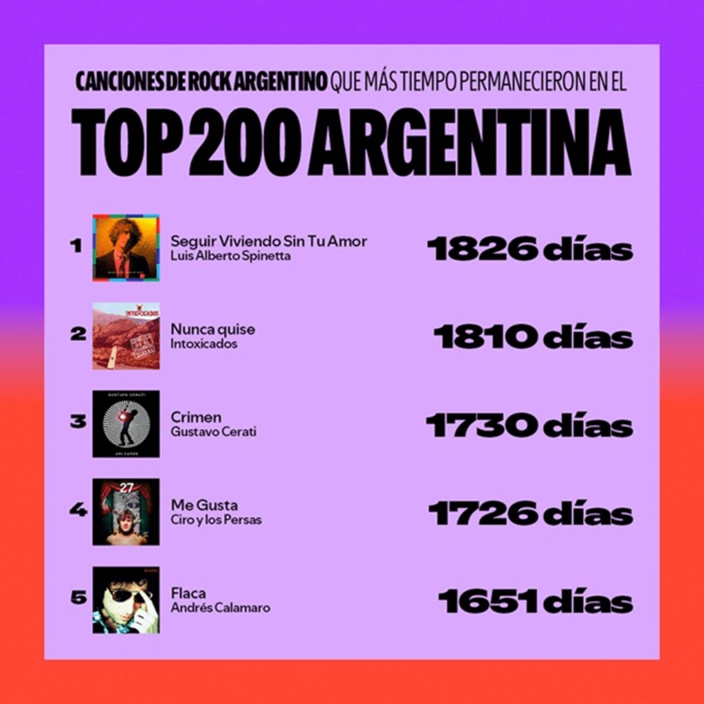 Entre los artistas que más reproducen los jóvenes se encuentran nombres y bandas icónicas en lo que respecta al rock nacional, como lo son Patricio Rey y sus Redonditos de Ricota, Soda Stereo, Andrés Calamaro, Callejeros, Charly García e Intoxicados. Aunque propuestas como las de Piti Fernández, El Plan De La Mariposa, Airbag, Ricardo Iorio y Conociendo Rusia son las que más han crecido en la plataforma en el último tiempo.