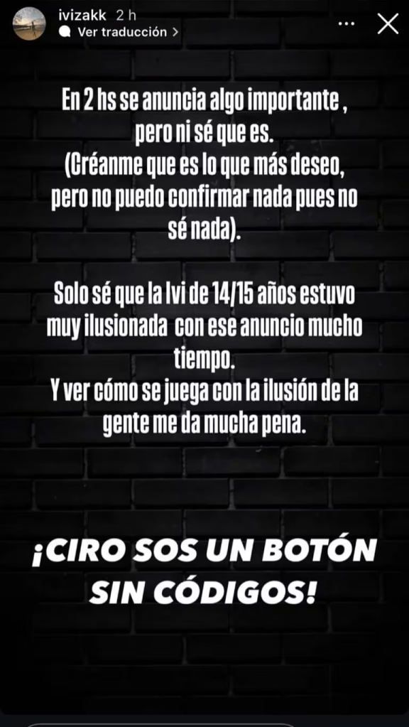 “En 2 horas se anuncia algo importante, pero ni sé qué es (…) Solo sé que la Ivi de 14, 15 años estuvo muy ilusionada con ese anuncio mucho tiempo. Y ver cómo se juega con la ilusión de la gente me da mucha pena”, escribió Ivi Zakkour sobre una historia de Instagram que publicó en su perfil personal. Ella trabaja como community manager y creadora de contenido de Ritual 87, con lo cual hizo mucho ruido la frase con la que cerró su mensaje: “¡CIRO SOS UN BOTÓN SIN CÓDIGOS!”.