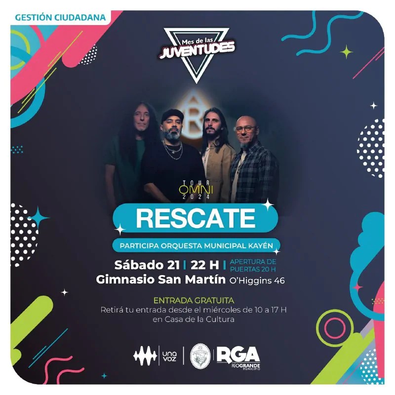 El recital será este sábado 21 de septiembre a las 22 horas, en el Gimnasio del Club San Martín. Estará protagonizado por la reconocida banda argentina “Rescate” y nuestra Orquesta Municipal Kayén, quienes presentarán en conjunto el nuevo disco de la banda “Omni” .