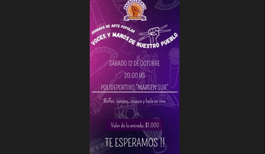 El bachillerato popular “Presente” se encuentra organizando una “jornada de arte”, para el próximo sábado 12 en el gimnasio municipal de la margen sur del río Grande. Se presentarán artistas de diferentes rubros y habrá un buffet para recaudar fondos, que se destinarán al funcionamiento de la institución. Las entradas ya se encuentran a la venta y tienen un precio simbólico de 1000 pesos.