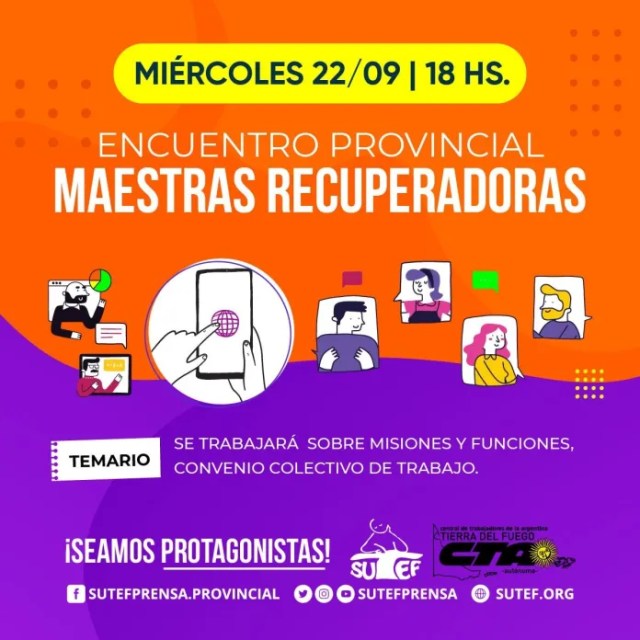 SUTEF convoca Encuentro Provincial de Maestras RecuperadorasMiércoles 22/09 🕐 18 horas. Modalidad virtualTemario: Misiones y funciones Solicitá enlace para poder participar a Luana: 2901 47-5147 o Adriana: 2964-605987 ¡Seamos protagonistas! SUTEF junto a las y […]