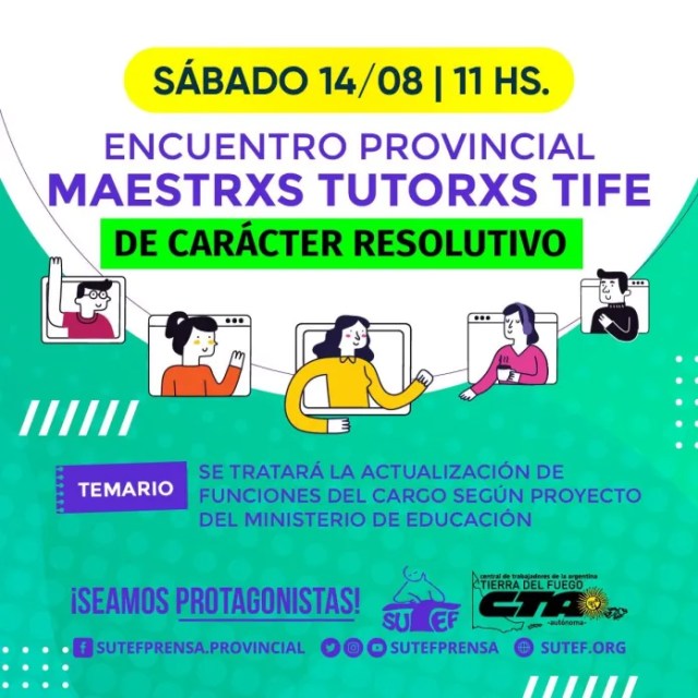 SUTEF convocaEncuentro Provincial Resolutivo de Maestros Tutores TIFESábado 14 de agosto a las 11 horas.Temario: Se tratará la actualización de funciones del cargo según el Proyecto del Ministerio de Educación.¡Solicitá link para participar!Adriana: 2964-605987Julio: 11-56066032