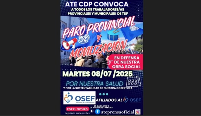 La conducción provincial de la Asociación Trabajadores del Estado resolvió un paro de actividades para el próximo martes 8, con movilización. Es por la crítica situación de la OSEF y la consigna con la cual […]